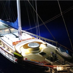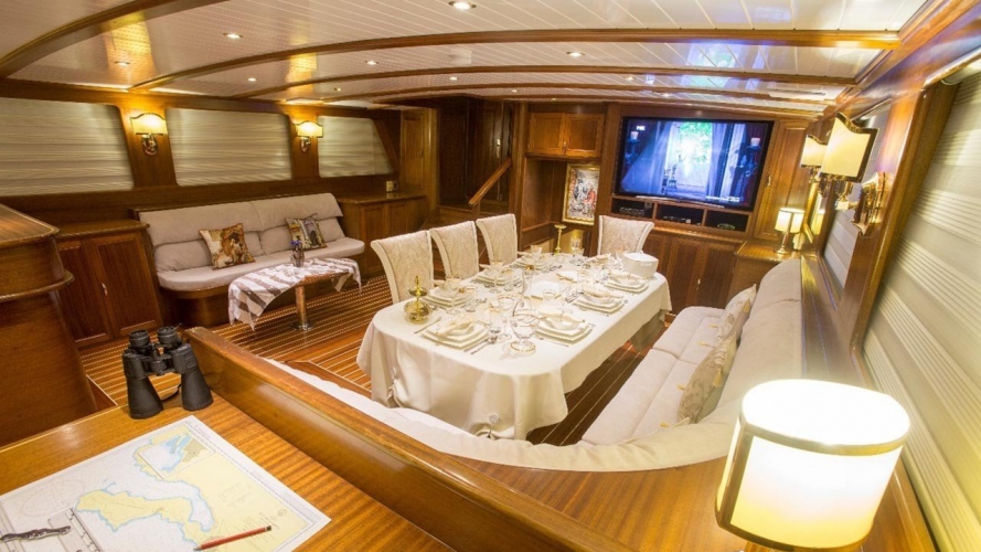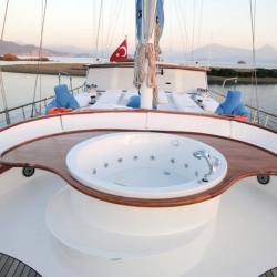Das Innendesign der Ece Berrak Yacht wurde geschmackvoll eingerichtet, um den Gästen das Gefühl zu geben, in Luxus zu schwimmen. Auf den Esstischen im Salon und auf dem Deck sind auffällige Tische gedeckt, so dass Sie nur noch verschiedene Geschmäcker genießen müssen. In der Lounge gibt es einen Fernseher, einen DVD-Player und eine Musikanlage. Während Ihre Mahlzeiten in einer voll ausgestatteten separaten Küche für Sie zubereitet werden, können Sie die Sonne auf der Liegewiese und den für alle unsere Gäste ausreichenden Kissen genießen.
