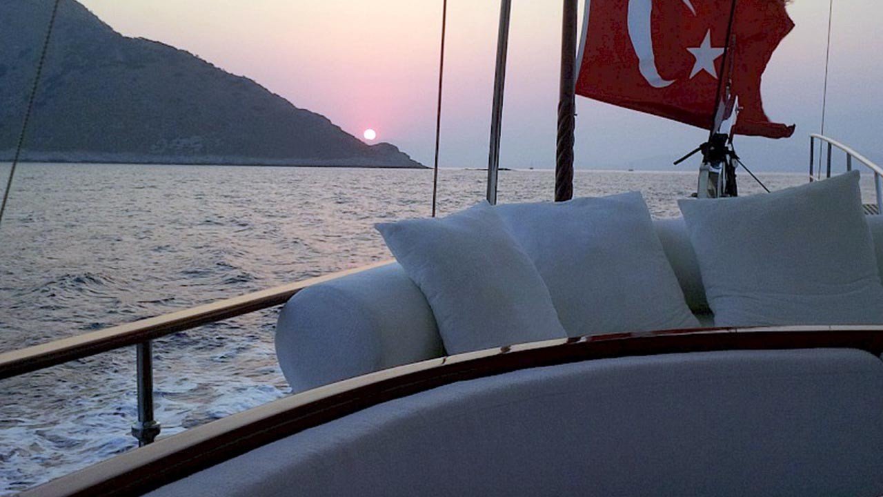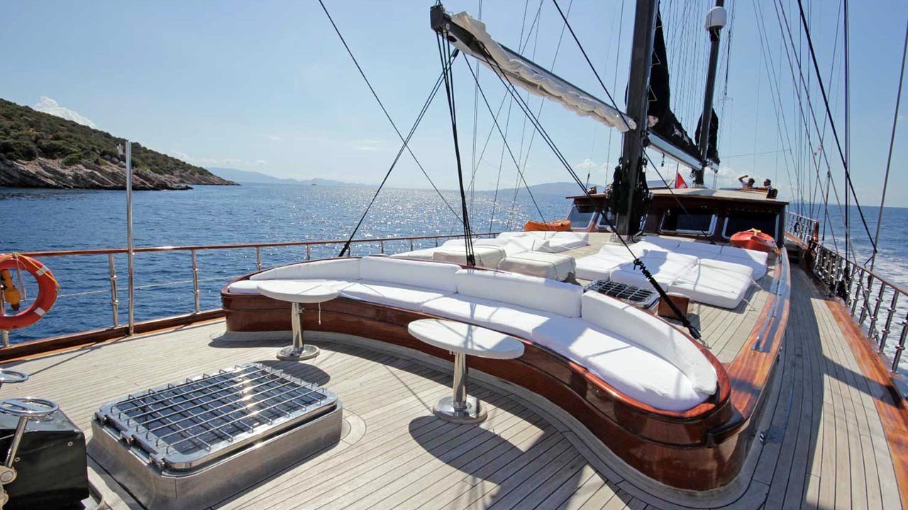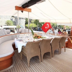 Das Innendesign der Kaya Guneri Plus Yacht wurde geschmackvoll dekoriert, um den Gästen das Gefühl zu geben, in Luxus zu schwimmen. Die Esstische im Salon und auf dem Deck sind auffällig gedeckt, so dass Sie nur noch verschiedene Geschmacksrichtungen genießen müssen. In der Lounge gibt es einen Fernseher, einen DVD-Player und eine Musikanlage. Während Ihre Mahlzeiten in einer voll ausgestatteten separaten Küche für Sie zubereitet werden, können Sie die Sonne auf der Liegewiese und den für alle unsere Gäste ausreichenden Kissen genießen.