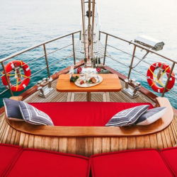 Le Rouge Gulet wird mit den Gästen sein, wann immer sie es wünschen, aber sie werden in ihren eigenen Bereichen sein, wenn sie allein sein wollen. Wir haben Personalkabinen, in denen unsere Crew untergebracht ist. Neben all diesen angenehmen Momenten wird das „Fest der Aromen“, das mit dem Frühstück am Morgen beginnt und den ganzen Tag über andauert, mit einem Mondscheindinner abgeschlossen. Das Ziel unserer Besatzung ist es, unsere Gäste glücklich zu machen.