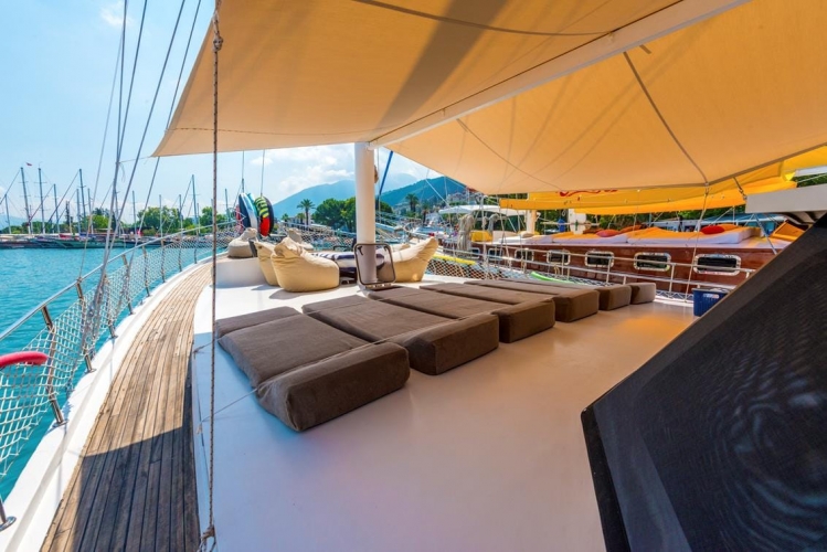 Nomade Gulet wurde 2002 vom Stapel gelassen, im Jahr 2018 hat Nomade Yacht seine aktuelle moderne Form mit einer umfassenden Renovierung genommen. 25 Meter lange Nomade Gulet mit 6 Doppelkabinen für Gruppen bis zu 12 Personen Fethiye MArmaris Gocek Bodrum Griechische Inseln Blue Cruise Tours.