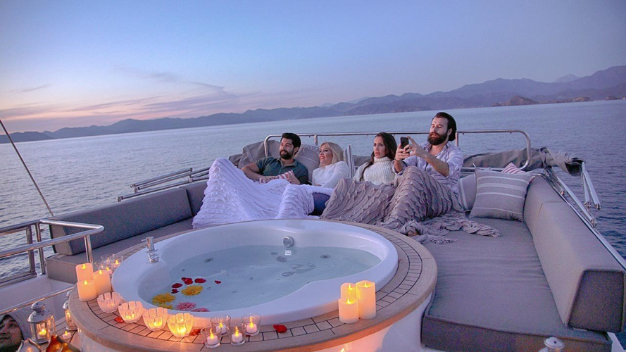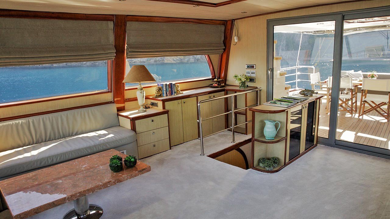 Auf dem Achterdeck gibt es eine gemütliche Sitzecke und einen Esstisch für sechs Personen. Auf dem Vordeck gibt es eine Sitzecke mit ausreichend Sonnenkissen und einem Couchtisch für Gäste. Auf der Flybridge gibt es große und bequeme Kissen, eine kleine Bar und einen Jacuzzi.