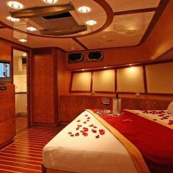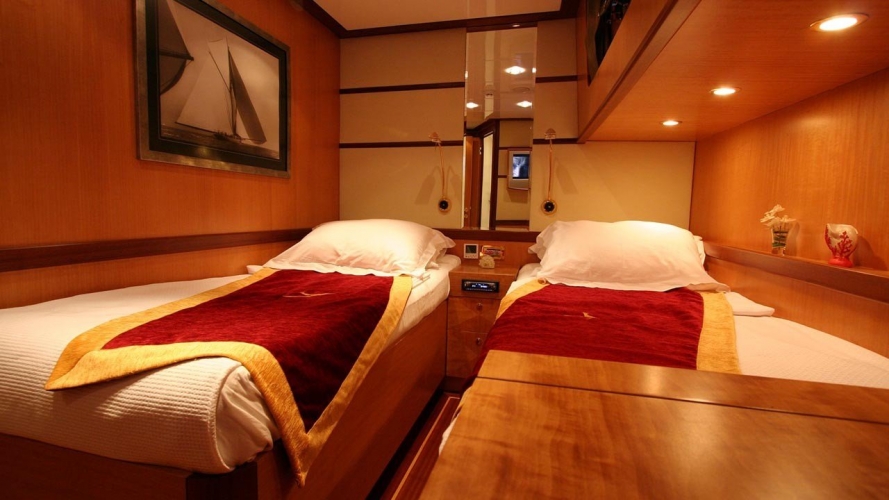 Serenity 86 Gulet hat 4 Kabinen, 1 Master-Kabine, 1 VIP-Kabine, 2 Zweibett-Kabinen, die stilvoll und komfortabel sind, mit eigener Dusche, WC und Klimaanlage. Sie werden sich sicher fühlen in unseren bevorzugten blauen Kreuzfahrtzielen wie Bodrum, Marmaris, Fethiye, Gocek mit Serenity 86 Boot dank seiner Radio-, GSM-Telefon-Navigationsausrüstung.