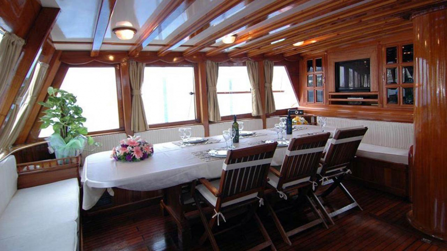 Es gibt genügend Sonnenliegen, Stühle und Service-Sets für alle Gäste. Diese Yacht, die unseren Blue Cruise Gästen Komfort, Luxus und Seelenfrieden bietet, erreicht 9 Seemeilen.