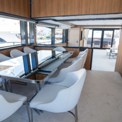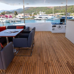 Seating group and dining table on the aft deck with teak floor