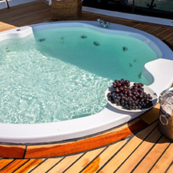 Jacuzzi, bar, dining table, sunbathing areas and shower on the upper deck