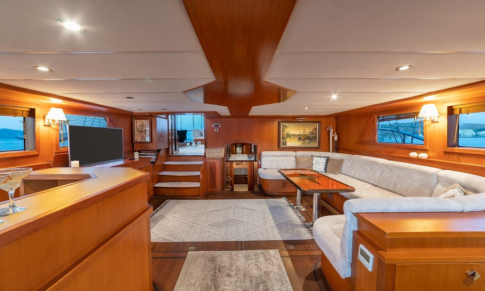- Large Deck: Equipped with teak wood floor, dining and seating areas on the aft and foredeck, sunbathing cushions and sea ladder.