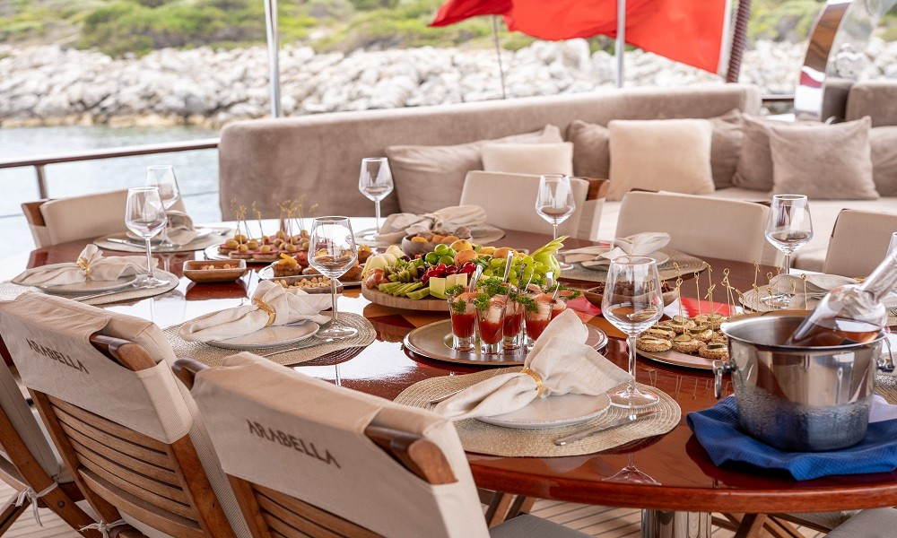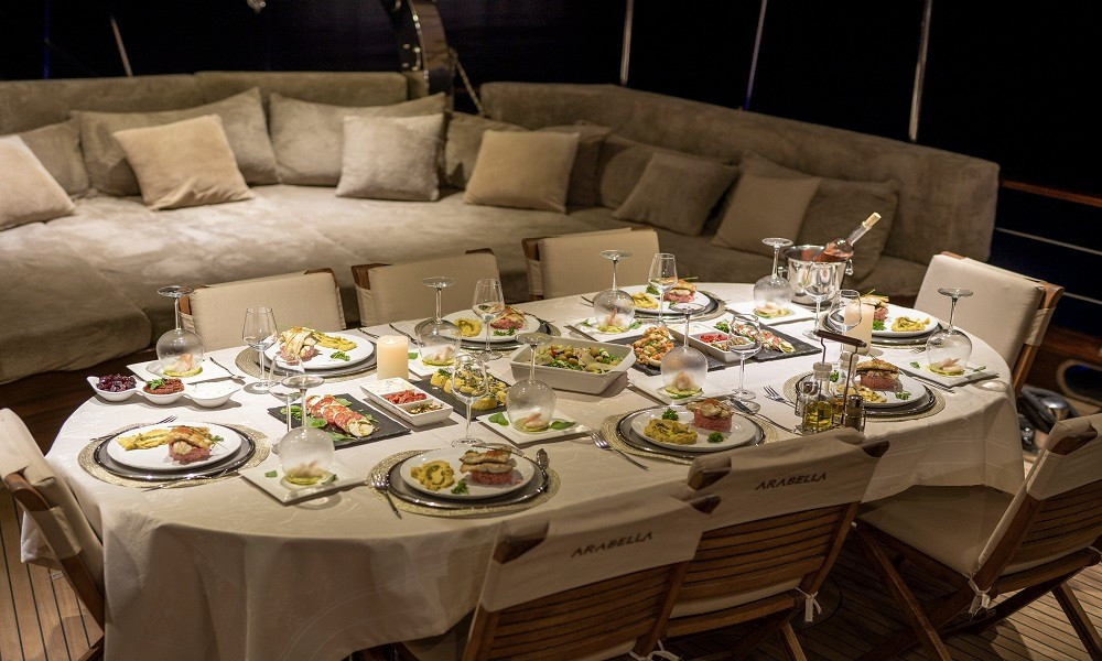 We can offer you full board accommodation during your holiday without your involvement. In this case, you can choose one of our Standard, Luxury or Deluxe menus and pay a price ranging from 65 to 100 Euros per person per day and have your all-inclusive holiday excluding alcoholic beverages. You can supply your alcoholic beverages as you wish and bring them to the boat.