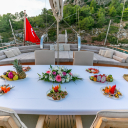 We can offer you full board accommodation during your holiday without your involvement. In this case, you can choose one of our Standard, Luxury or Deluxe menus and pay a price ranging from 65 to 100 Euros per person per day and have your all-inclusive holiday excluding alcoholic beverages. You can supply your alcoholic beverages as you wish and bring them to the boat.