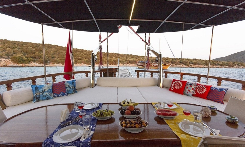 We can offer you full board accommodation during your holiday without your involvement. In this case, you can choose one of our Standard, Luxury or Deluxe menus and pay a price ranging from 45 to 65 Euros per person per day and have your all-inclusive holiday excluding alcoholic beverages. You can supply your alcoholic beverages as you wish and bring them to the boat.