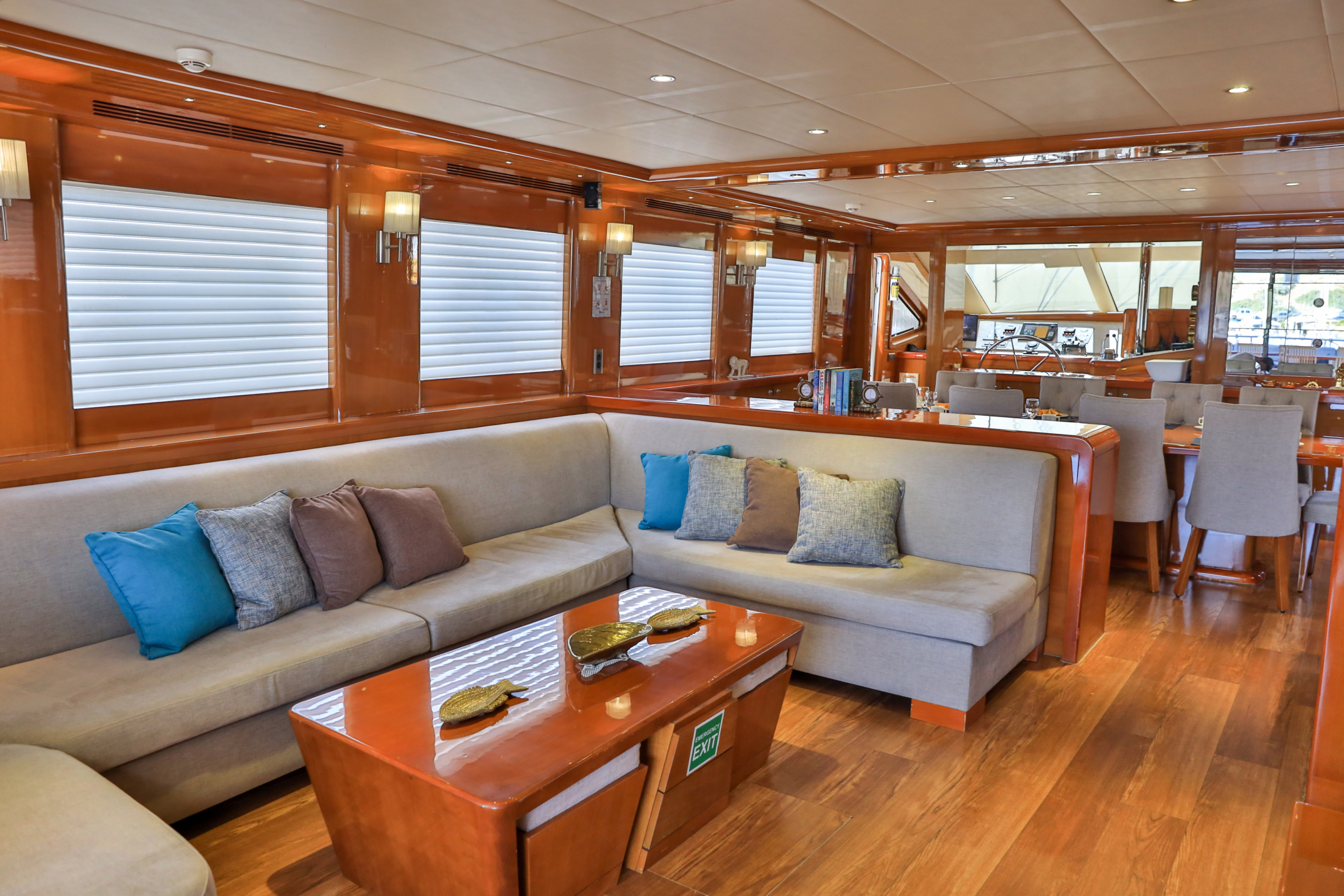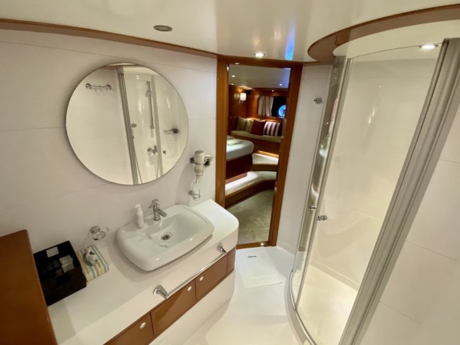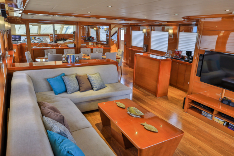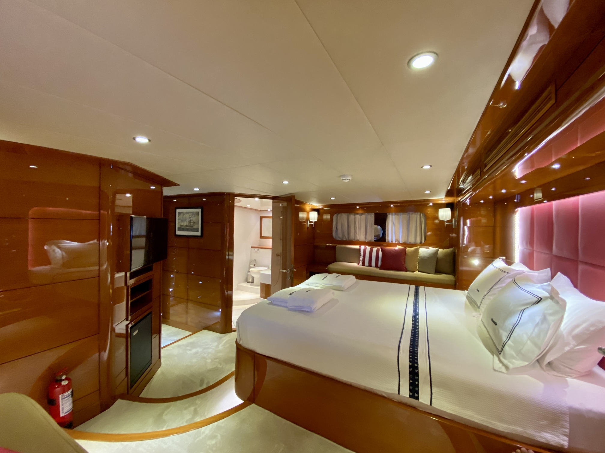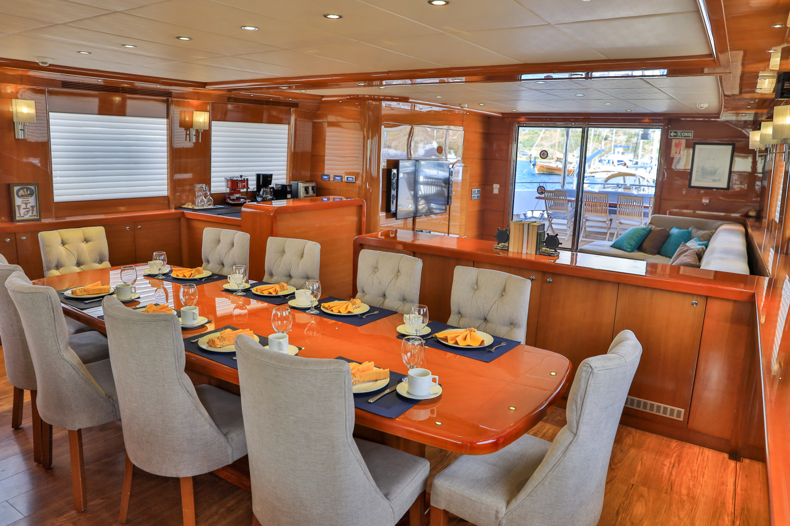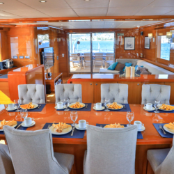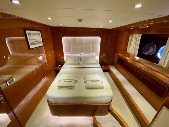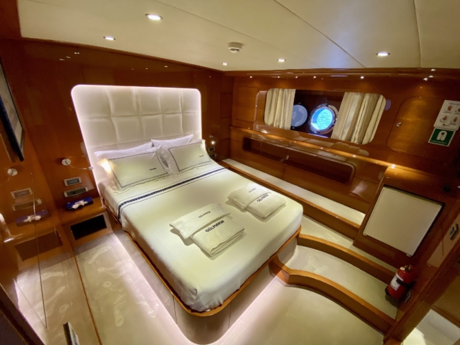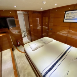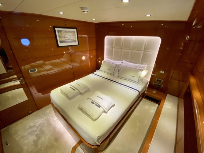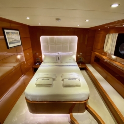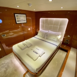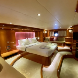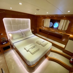 Our ultra luxury yacht is 37 metres long and has 1 master, 1 VIP, 2 double and 2 triple cabins. In addition to our spacious seating areas and cabins, our very stylishly designed lounge has a comfortable seating area with a TV unit and dining table for use in cooler weather.