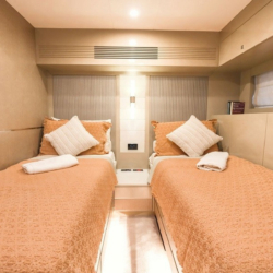 1 Master, 1 Twin and 1 Double cabin, each cabin is equipped with air conditioning, music system, private bathroom, hairdryer and towels. The lounge area offers home comfort with dining table, seating area, LCD TV, music system and Netflix.