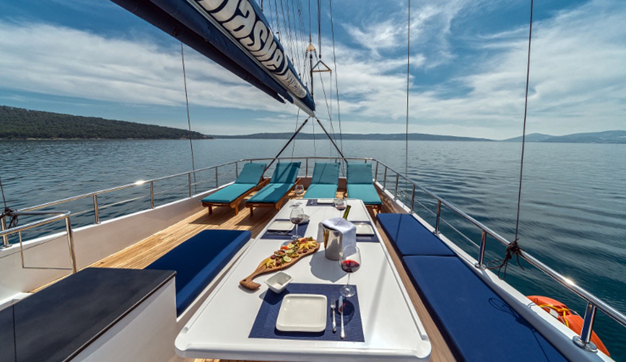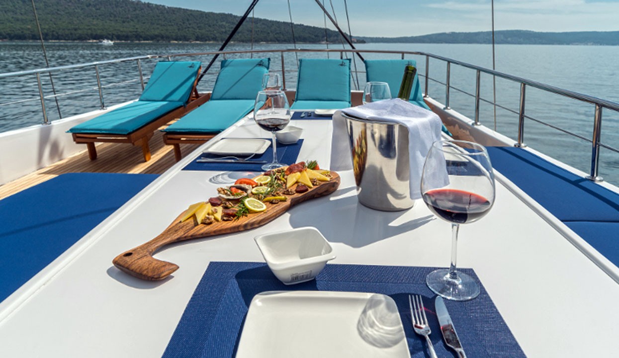 We can offer you full board accommodation during your holiday without your involvement. In this case, you can choose one of our Standard, Luxury or Deluxe menus and pay a price ranging from 45 to 65 Euros per person per day and have your all-inclusive holiday excluding alcoholic beverages. You can supply your alcoholic beverages as you wish and bring them to the boat.