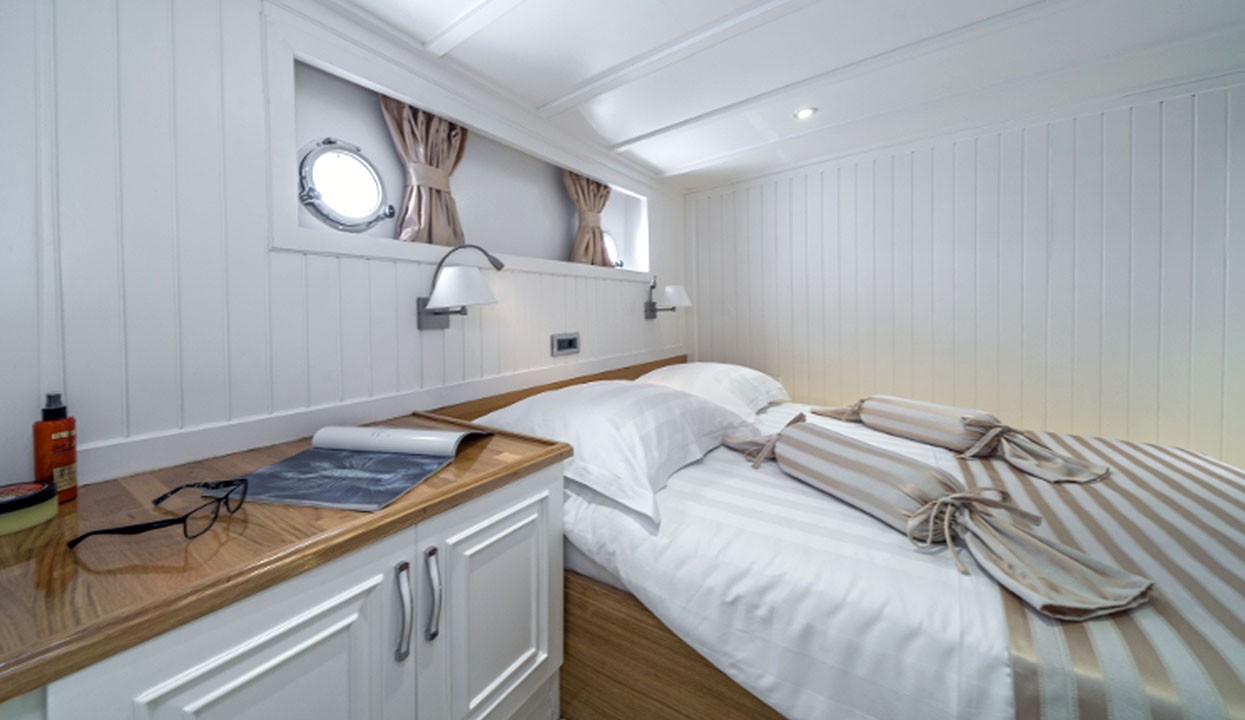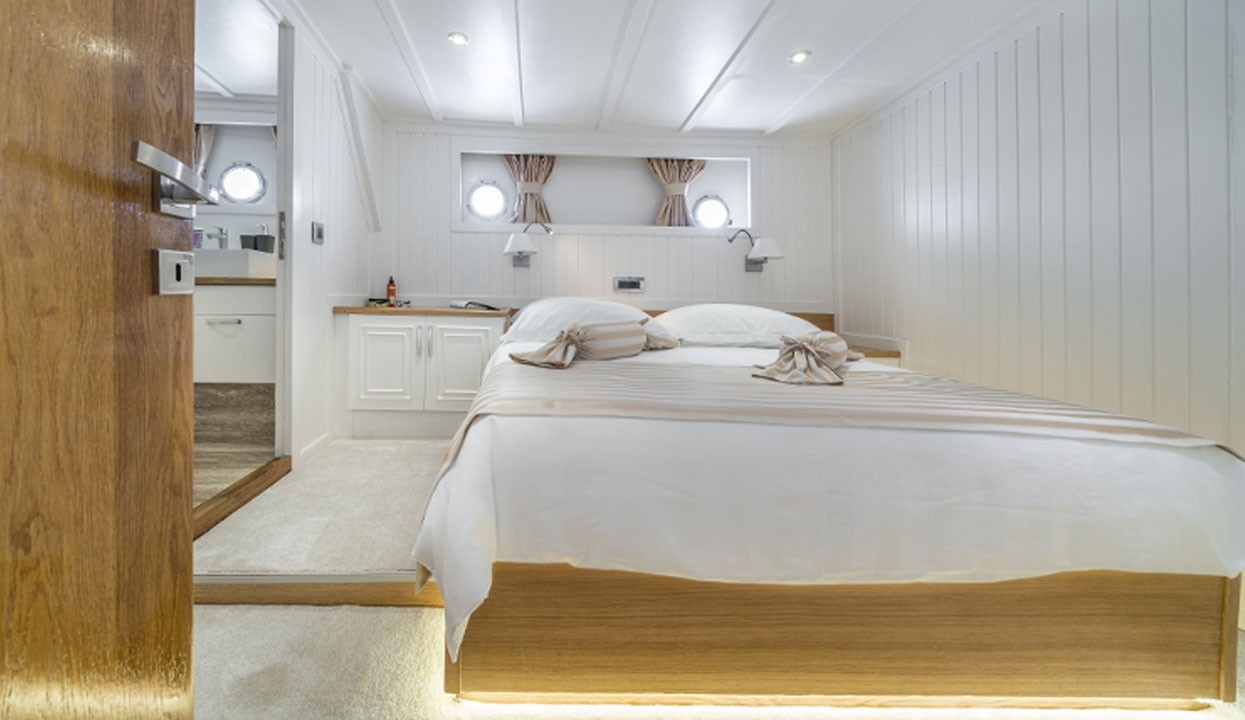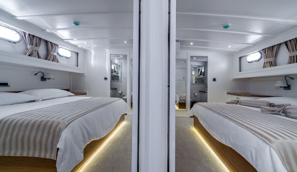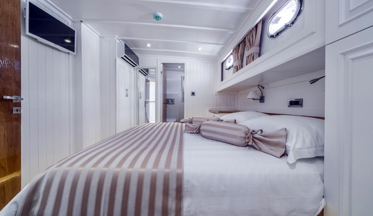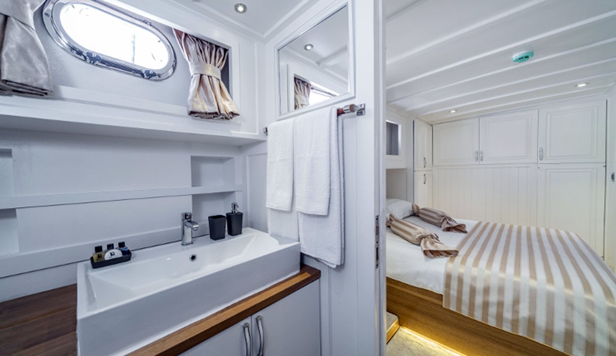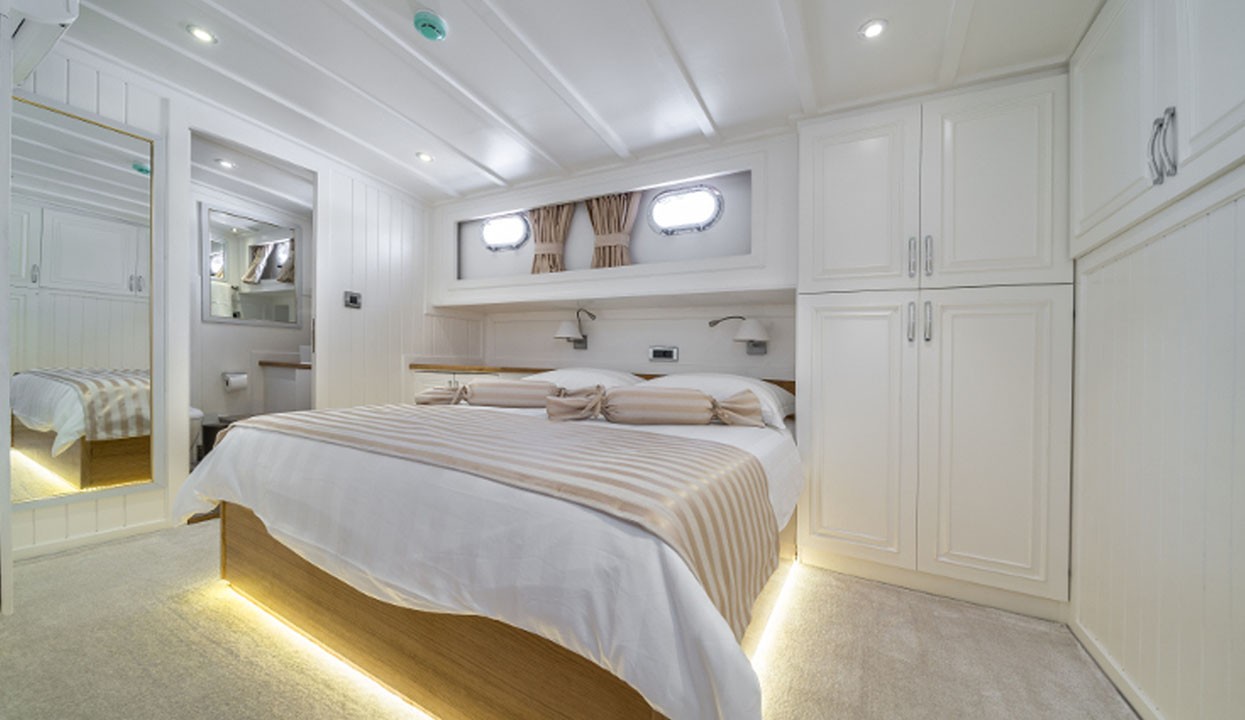 Maske 1 Gulet, 1 Master Cabin, 2 Vip Cabins, 2 Double Cabins, stylish and comfortable, with its own shower, WC and air conditioning, our yacht has 5 cabins.