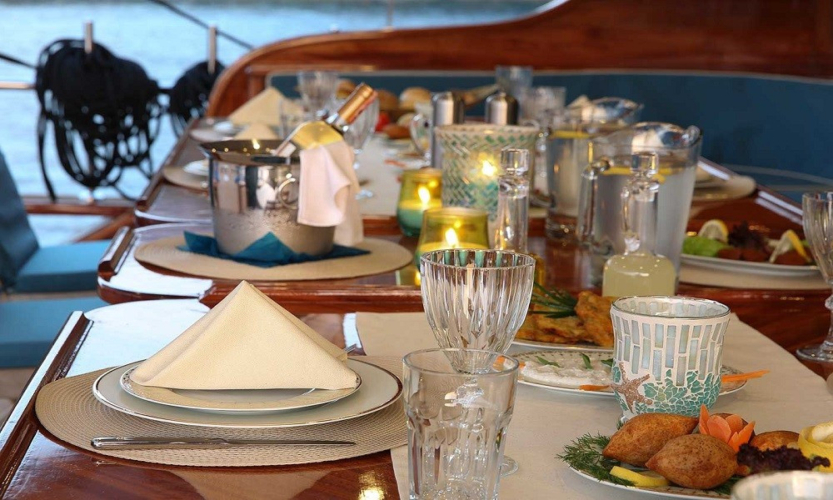 We can offer you full board accommodation during your holiday without your involvement. In this case, you can choose one of our Standard, Luxury or Deluxe menus and pay a price ranging from 45 to 65 Euros per person per day and have your all-inclusive holiday excluding alcoholic beverages. You can supply your alcoholic beverages as you wish and bring them to the boat.